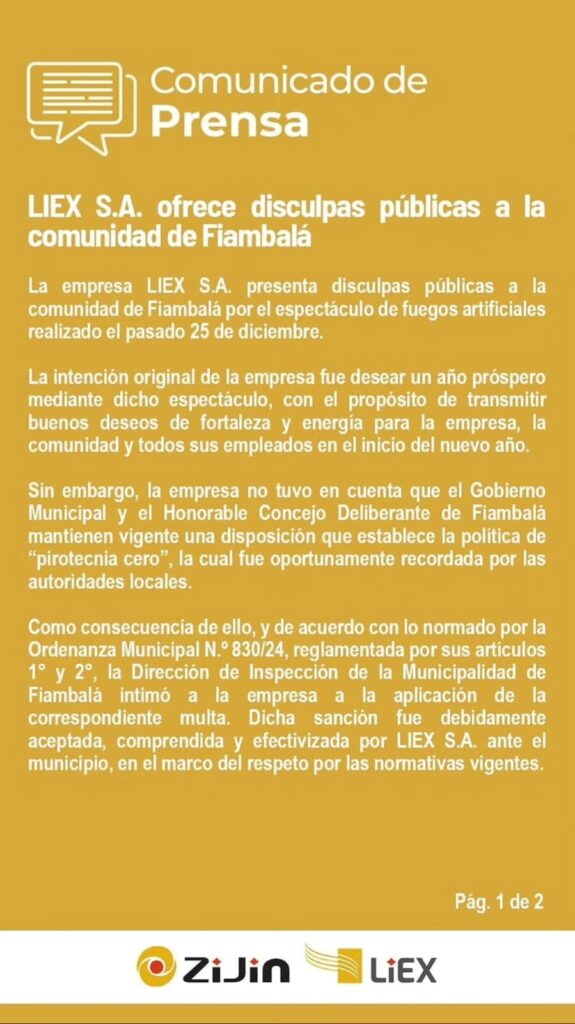 En lo que fue un acierto comunicacional, por su franqueza y rapidez, la empresa Zijin Liex pidió disculpas públicas y a la vez se puso a disposición de las autoridades, por un acto fallido a la hora de lanzar un mega show de fuegos artificiales en Fiambalá el pasado 25 de diciembre.