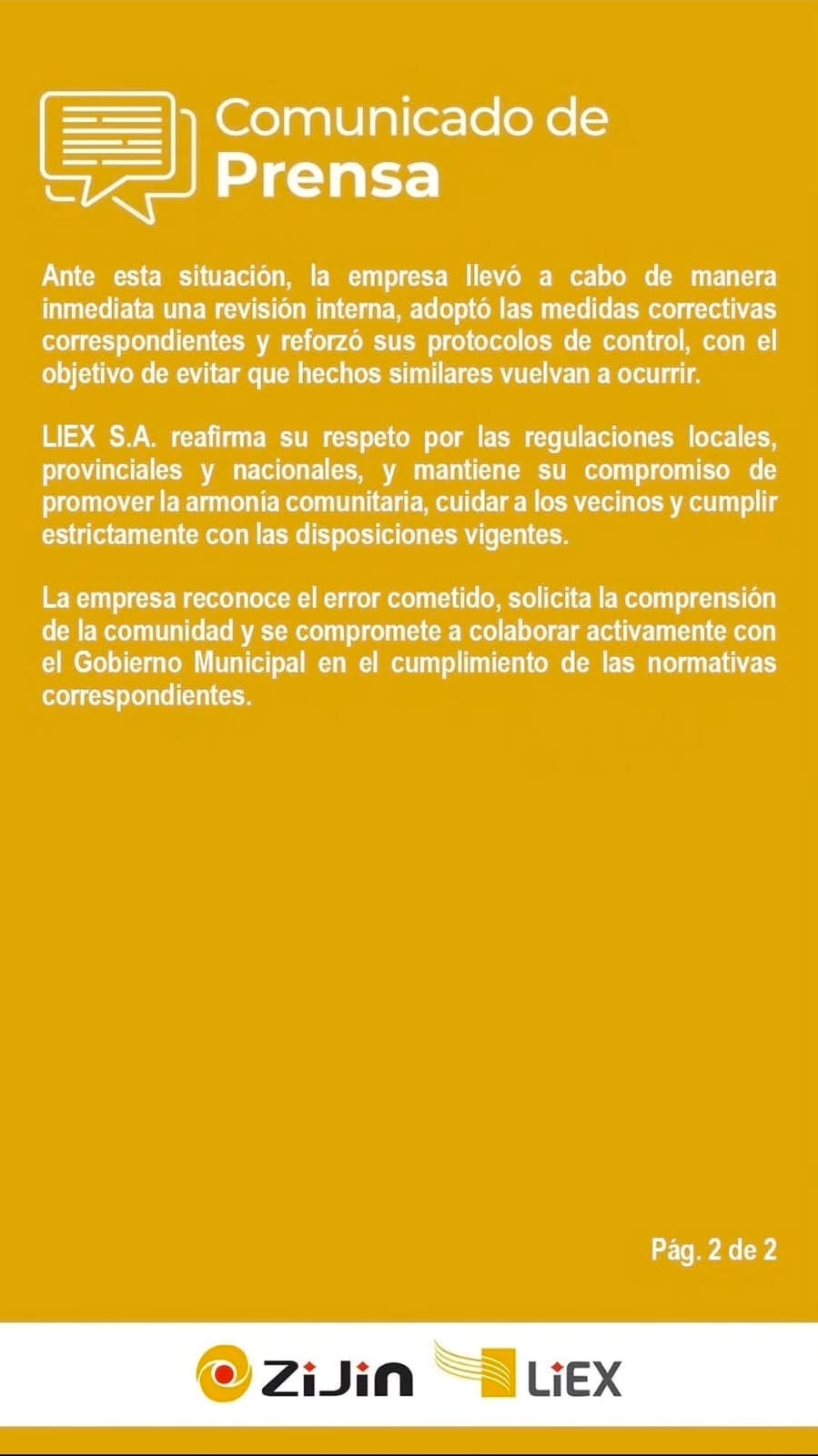En su comunicado, LIex informó que la Dirección de Inspección de la Municipalidad de Fiambalá intimó a la empresa a la aplicación de la multa correspondiente, conforme a lo establecido por la Ordenanza Municipal N° 830/24.