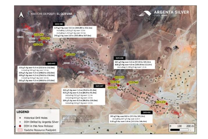 Los últimos intervalos múltiples de plata de alta ley interceptados fuera de los límites de recursos del depósito Yaxtché (“Yaxtché”), continúan demostrando continuidad mineralizada en la extensión noroeste (sondeos QVD-430, QVD-440 y QVD-443) y en la extensión sureste (incluido el sondeo QVD-436).